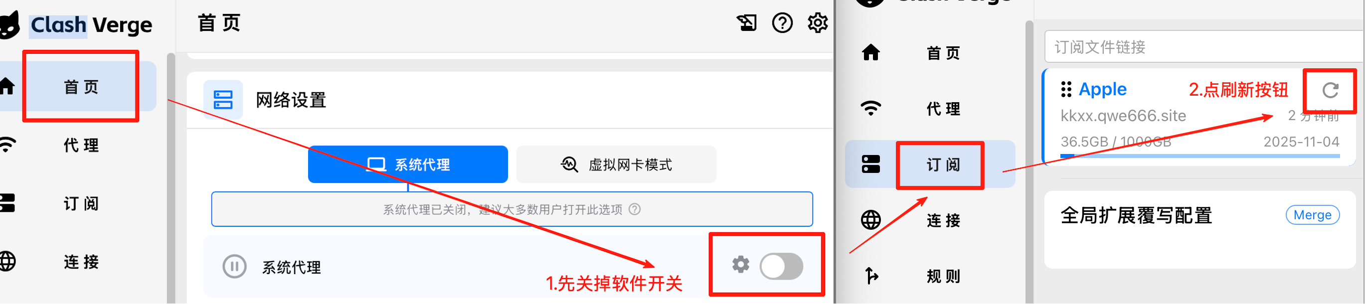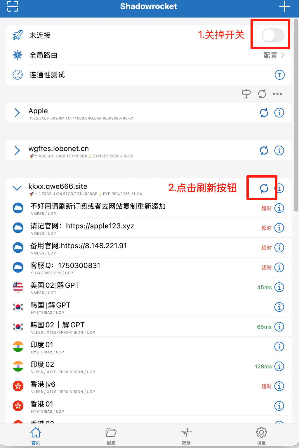 ### 小火箭更新教程如图:  --- ### Hiddify软件刷新教程:  --- ### Clash 软件刷新教程:
